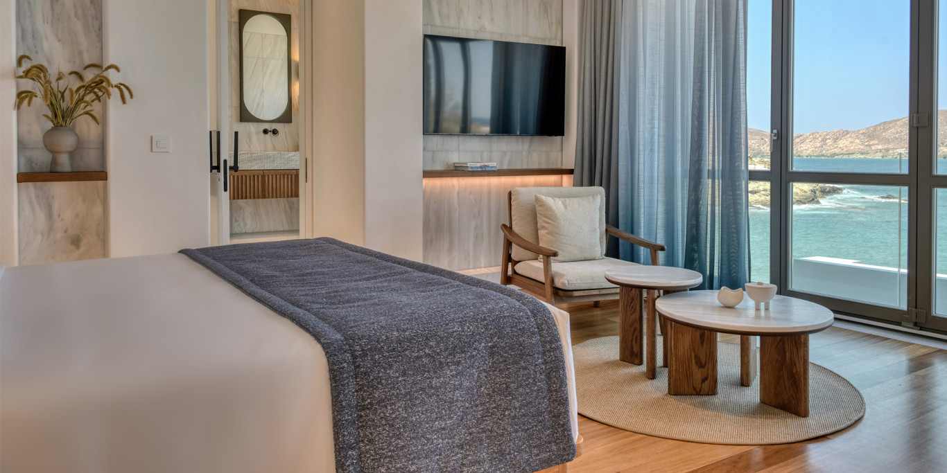 Step into luxury with our exquisite two-bedroom and two-bathroom suite boasting stunning Aegean Sea views. Spanning 86 square metres, this retreat accommodates up to four guests for an unforgettable stay.