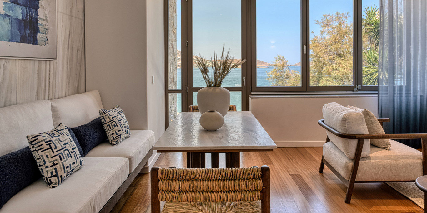 Experience unparalleled luxury at our Junior Suites, boasting breathtaking Aegean Sea views. With an average size of 80 square metres, these suites seamlessly fuse indoor and outdoor spaces. The elegant design and radiant atmosphere cater to refined preferences, ensuring a lavish escape for absolute relaxation. Each suite boasts a king-size bed and a queen-size sofa bed, ensuring optimum comfort and flexibility.